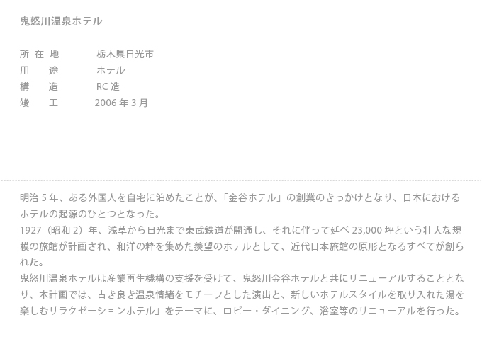 The opening of the "Kanaya Hotel" was prefaced by a land owner letting a foreigner stay at their home in 1872, and marked the beginning of the hotel business in Japan. In 1927, the Tobu Railway from Asakusa to Nikko opened, accompanied by a huge hotel blending western and Japanese styles, which would become the model for modern Japanese-style hotels. The Kinugawa Onsen Hotel was renovated together with the Kanaya Hotel. The lobby, dining room and bathrooms were renewed, combining decorations evoking a nostalgic hot spring mood with a new relaxation-focused hotel style.